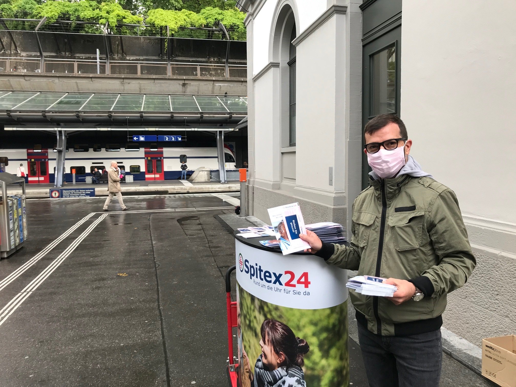 Am 10. Juni 2020 wurden in der Badstrasse in Baden Schutzmasken verteilt. Am 11. Juni am Bahnhof Stadelhofen in Zürich wo wir auch am 18. Juni nochmal vertreten sind.